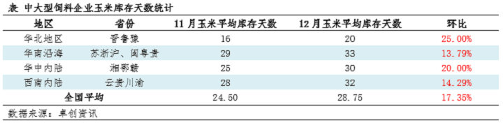截至12月底,中大型飼料企業(yè)玉米庫存均有增加,且多數(shù)庫存在1個月以上。進入1月份,南方飼料企業(yè)備貨基本收尾,以訂單合同為主,高價現(xiàn)貨簽單意向不高。且生豬價格持續(xù)低迷,終端養(yǎng)殖利潤在盈虧線浮沉,春節(jié)前銷區(qū)玉米購銷偏淡,玉米價格實質性上行空間或偏窄。