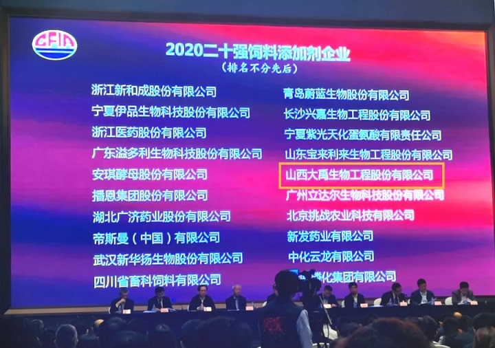 山西大禹生物工程股份有限公司獲評(píng)“2020二十強(qiáng)飼料添加劑企業(yè)”榮譽(yù)稱號(hào),并受到農(nóng)業(yè)農(nóng)村部領(lǐng)導(dǎo)高度評(píng)價(jià)。